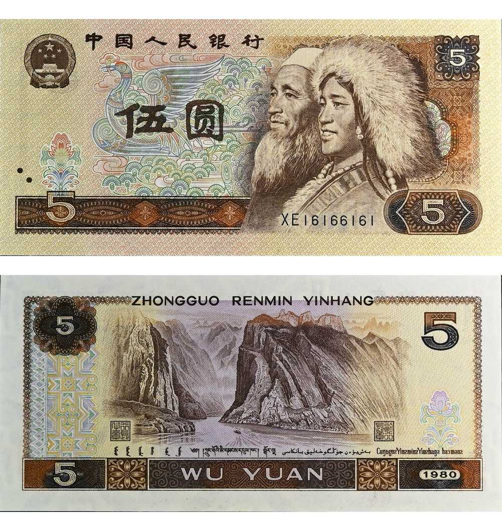 1980年第四版人民币伍圆一枚,冠号XE16166161。数二,纸张硬挺,纹理清晰,色彩明艳。