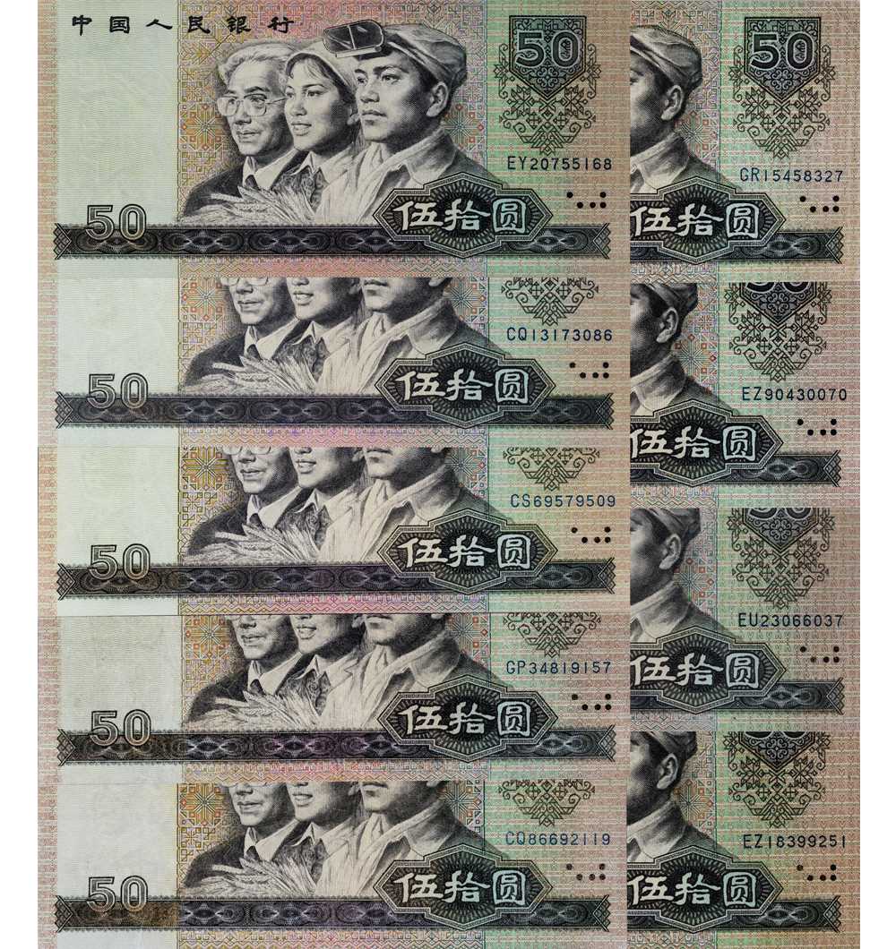 1980年第四版人民币伍拾圆九张一组,冠号为GP34819157、CS69579509、CQ13173086、EY20755168、EZ18399251、EU23066037、EZ90430070、EZ18399251、CQ86692119、GR15458327。分数为66*2、67*2、67EPQ*1、68EPQ*4。两张天蓝冠号,一张关门冠,颜色鲜艳,保存完好。