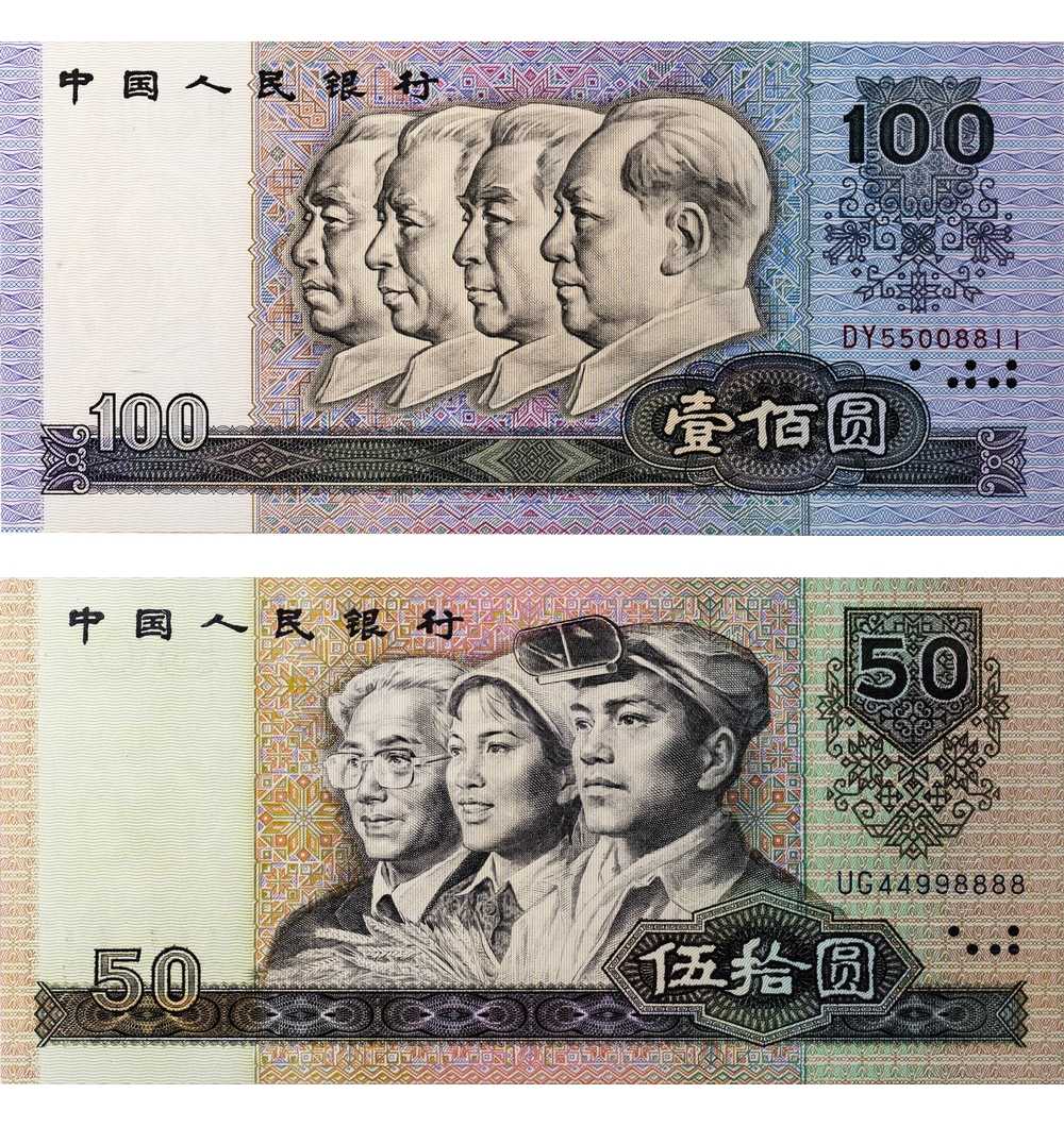 1990年第四版人民币伍拾圆、壹佰圆两枚一组,冠号DY55008811、UG44998888。四对子,纸张硬挺,纹理清晰,色彩浓郁纯正。