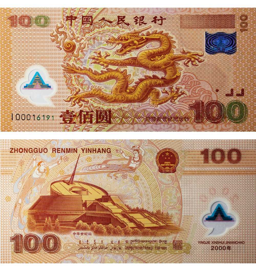 2000年中国人民银行龙钞壹佰圆一枚,冠号I00016191。纸张硬挺,自然波纹起伏,色彩浓郁厚重。