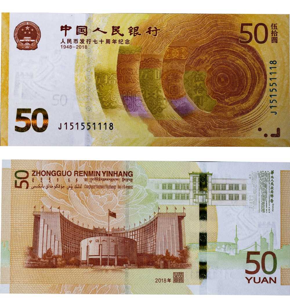 2018年人民币发行七十周年纪念50元一张,冠号J151551118。无347,88尾号,518我要发组合。纸张硬挺,纹理清晰,色彩明丽纯正。