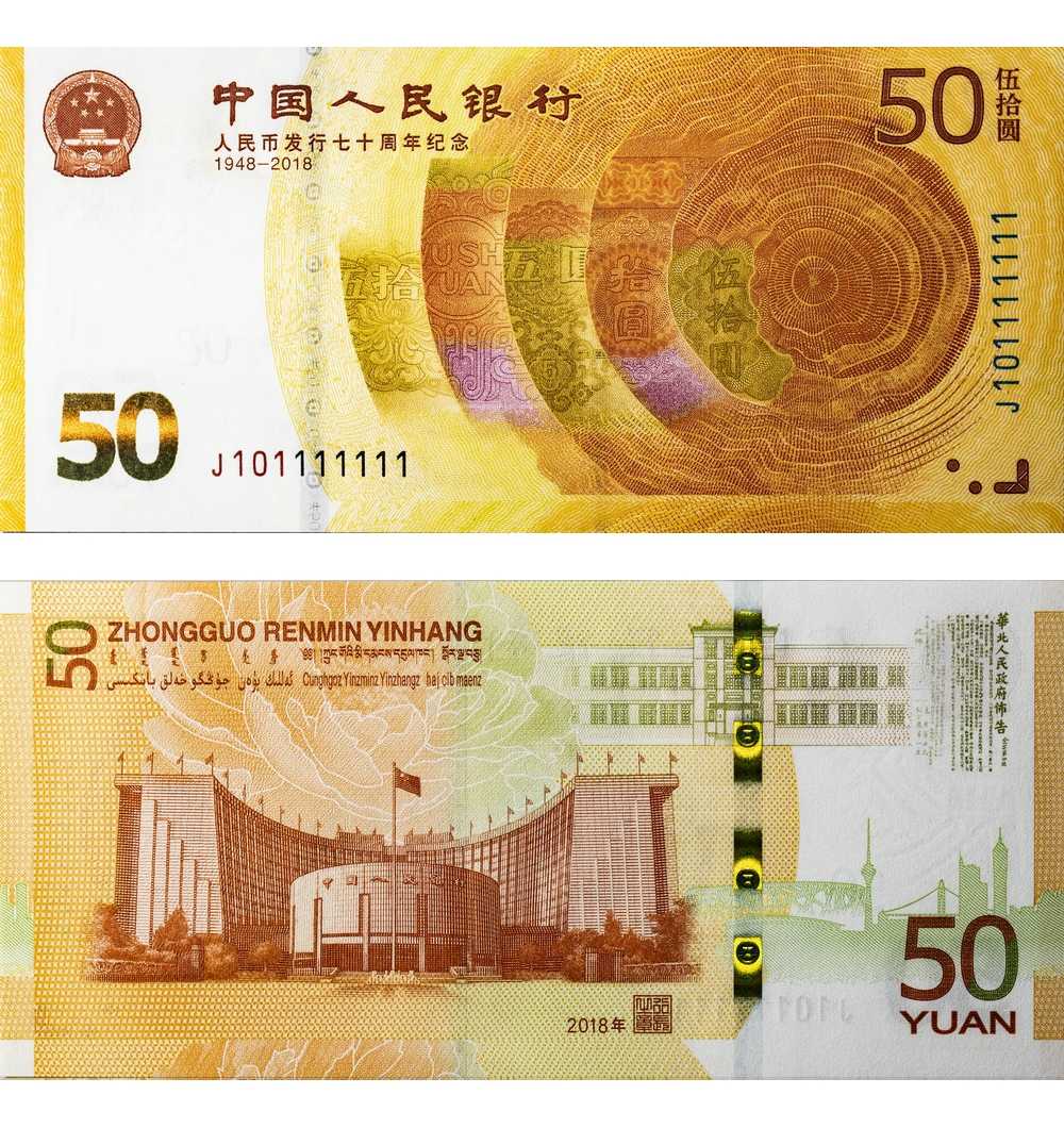 2018年人民币发行七十周年50元纪念钞,冠号J101111111,数二。纸张硬挺,纹路清晰,色彩浓郁醇正。