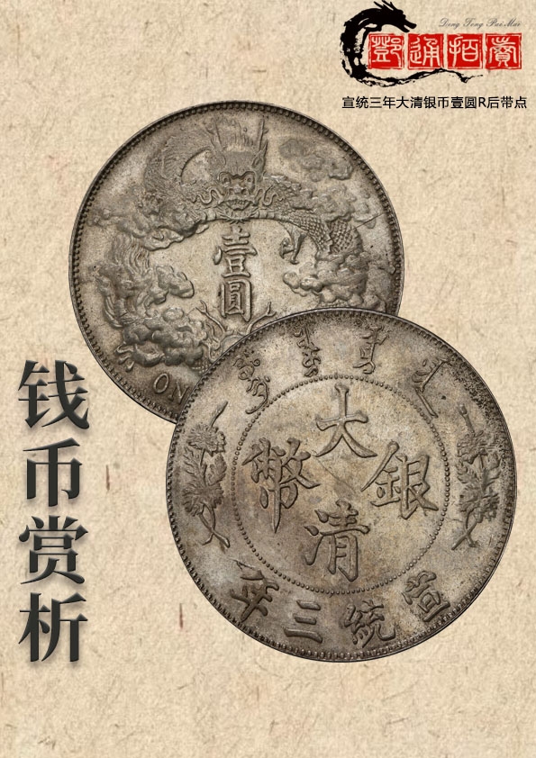 宣统三年大清银币壹圆R后带点版,其设计独特、工艺精湛。正面珠圈内为汉文“大清银币”四字,字体苍劲有力;珠圈外上为满文,下为汉文“宣统三年”字样,左右两侧分列长枝菊花纹饰,寓意吉祥。背面中心为“壹圆”计值,外围巨龙腾空环绕,龙身鳞甲分明,龙须垂落飘逸,火球置于下方,边缘镌刻英文“壹圆”。而最为引人注目的,便是英文“DOLLAR”后那一点,它如同点睛之笔,为整枚银币增添了几分神秘与独特。