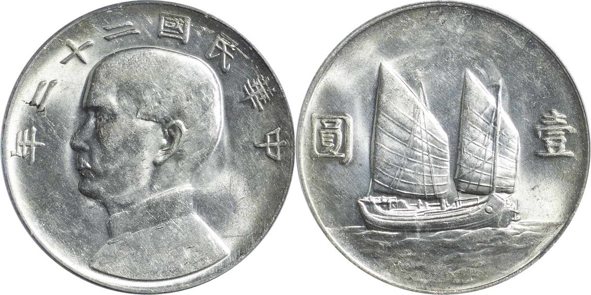 民国二十二年孙像帆船 壹圆