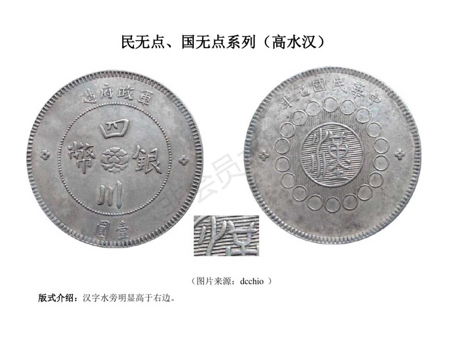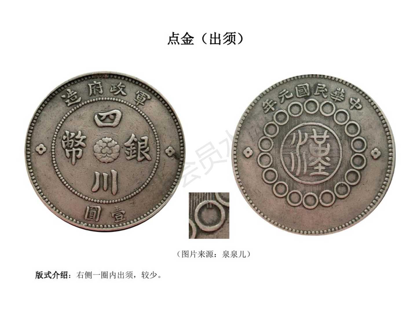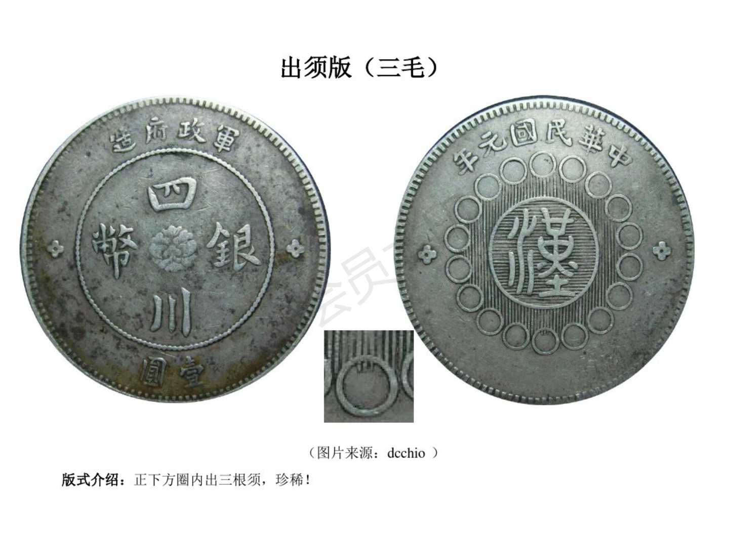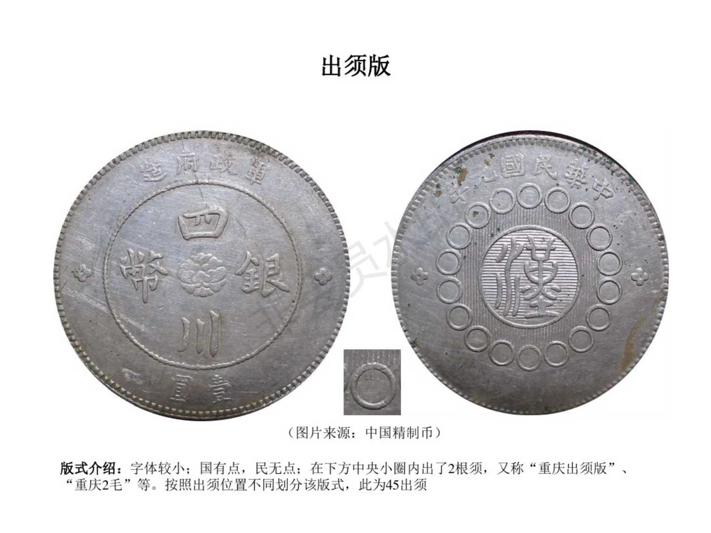 3.民国8年(1919)重庆铜元局应重庆商会要求,也是成都造币厂委托,首次代铸100万元。汉字下小圈多两须,后称重庆垂须版,全川可通用。