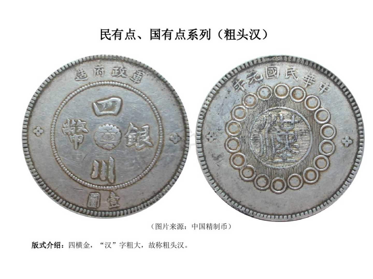 2.民国2年(1 2)4月成都造币厂开始铸行全字旁汉字大洋,全川可通用,至民国12年(1923)俗称旧汉字大洋,民国12年(1923)后停铸。