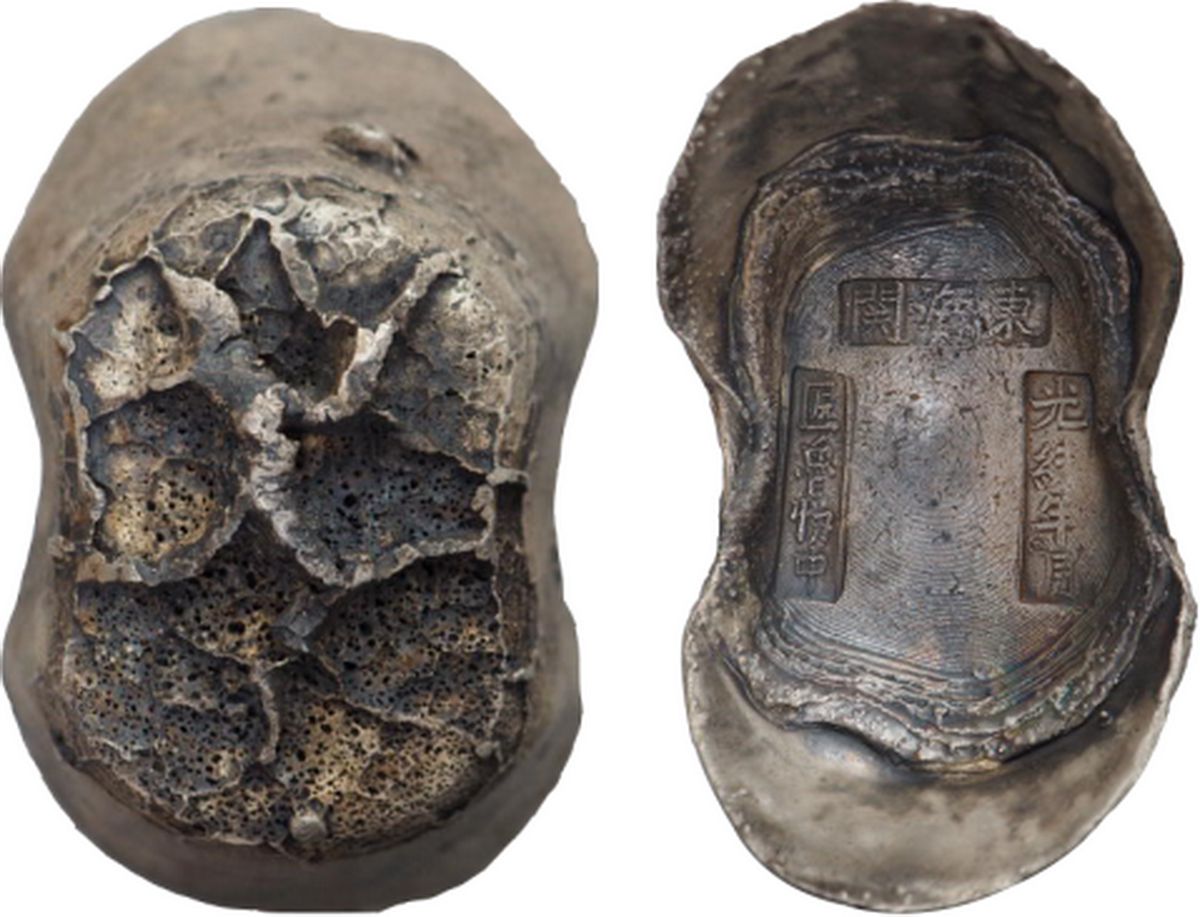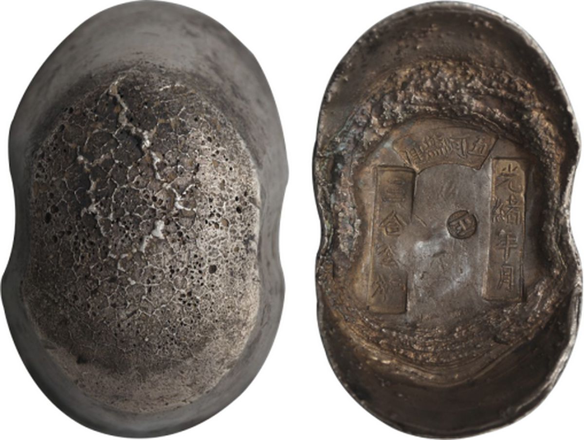 【银锭部分】(Lot2001-2025),GBCA-MS61清安徽五河盐厘三合公炉五十两,锭型规整,包浆均匀,戳记清晰,经过多轮竞价,由888号买家竞得,40万落槌,46万成交;GBCA-MS62清山西阳曲县五十两,宝面平坦,浅薄包浆,26万落槌;中乾-AU58清山东东海关匠鲁协中五十两,戳记清晰,包浆均匀,25万落槌。