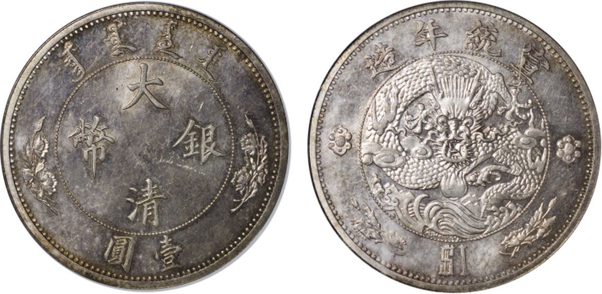 【机制币部分】(Lot3047-3499),PCGS-AU55萧耀南像五秩纪念无币值,图文清晰,打制精美,厚重原味包浆,35万落槌。两枚味道近似的PCGS-MS65宣统三年大清银币壹圆,底板平整光洁,图文立体,浅薄包浆,首枚38万落槌,第二枚40万落槌,46万成交;两枚PCGS-MS62袁世凯像共和纪念壹圆连续上拍,首枚香槟色包浆,32万落槌,第二枚深彩包浆,40万落槌。