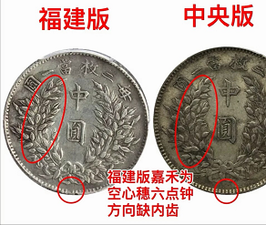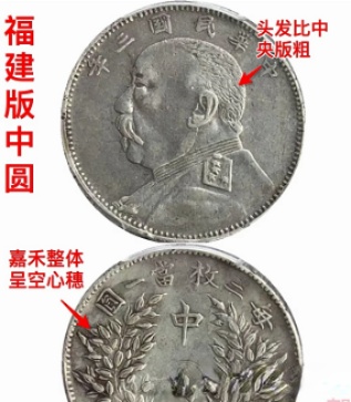 一、福建版:福建版大头中圆的特征,正面头发像烫过似的,比中央版要粗,背面嘉禾花纹要比中央版繁琐,多呈空心状,背面下方有缺齿暗记,这是福建版所通有的特点。