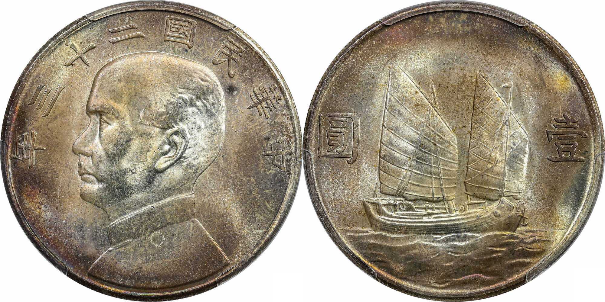 民国二十三年孙中山像背帆船壹圆银币一枚,Y-345/LM-110/K-624。打制规范,清晰立体,底板平整,灰色包浆,旋转底光。PCGS MS65 43711953