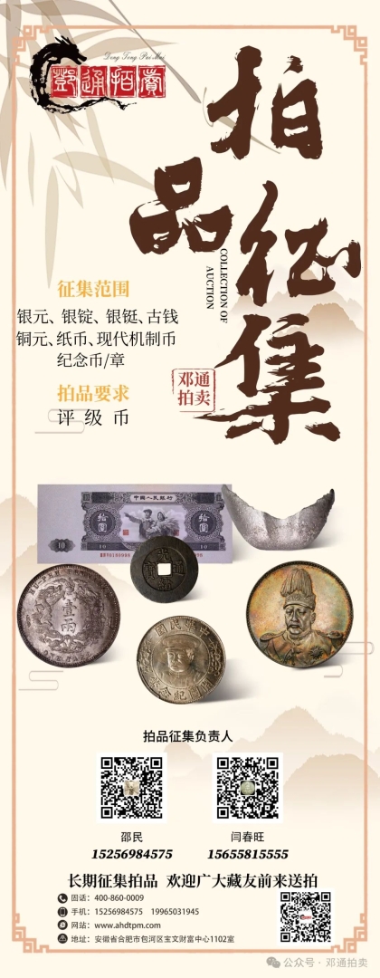 在收藏界璀璨的星河中,每一件藏品都承载着历史的记忆与文化的韵味。安徽邓通,作为业界知名的拍卖平台,现面向广大藏友征集银元、银锭、银铤、古钱、铜元、纸币、现代机制币以及各类纪念币/章。我们专注于精品,力求为每一件拍品找到它的历史价值与艺术归属。
